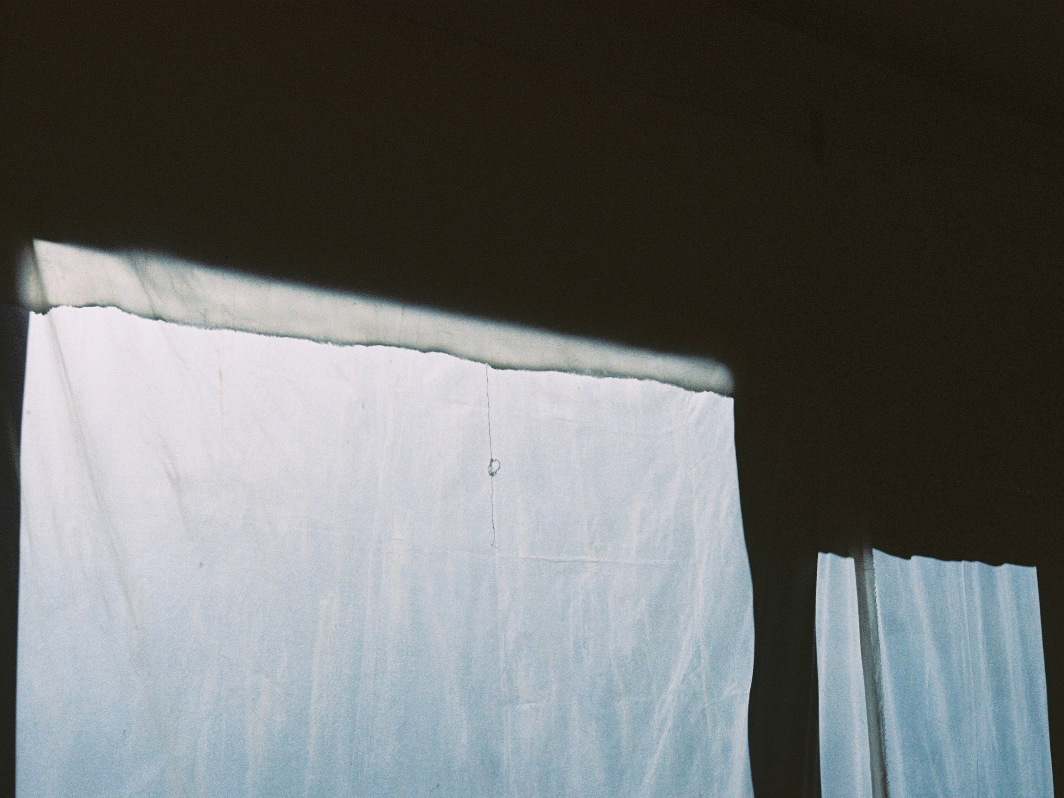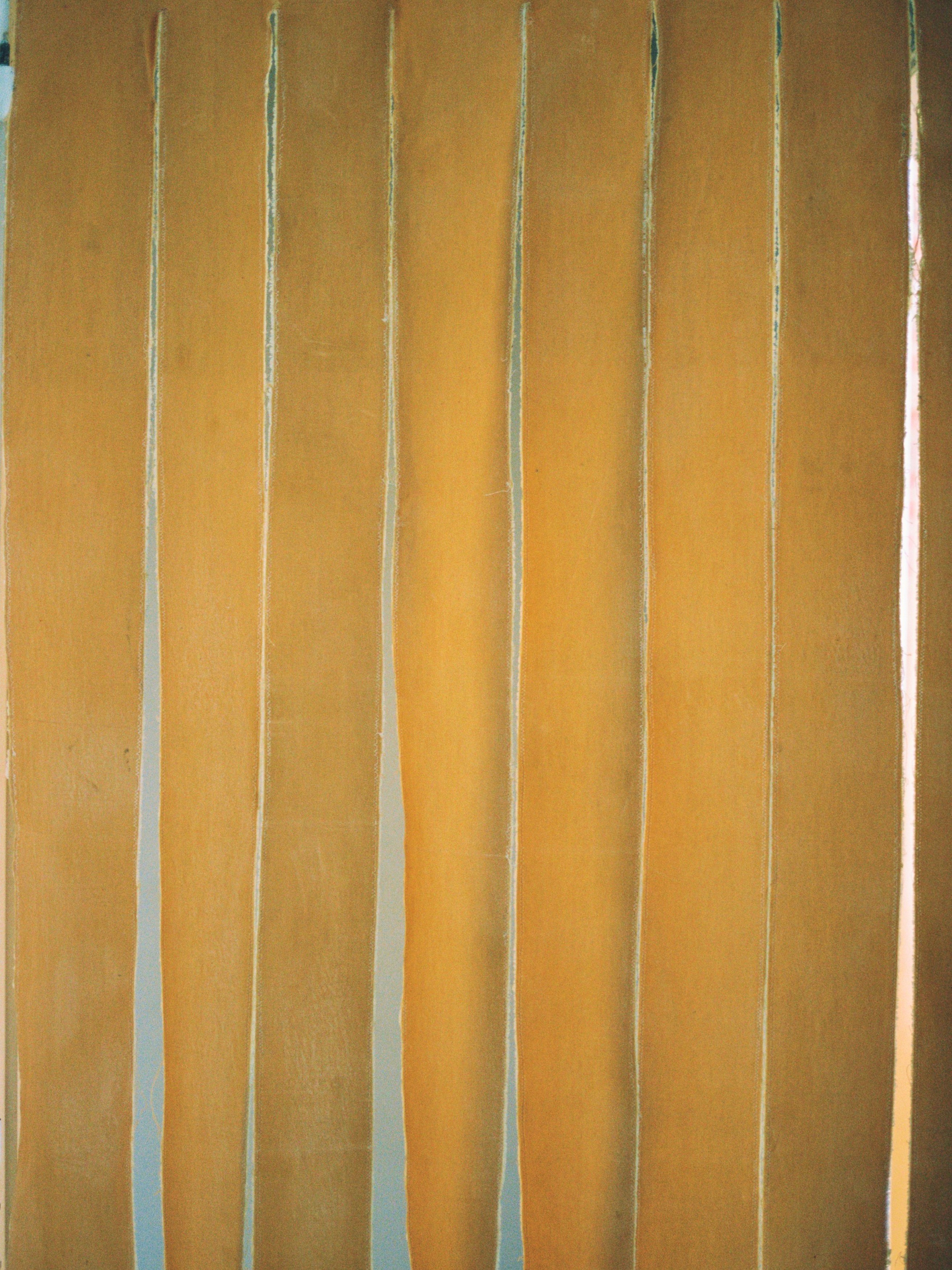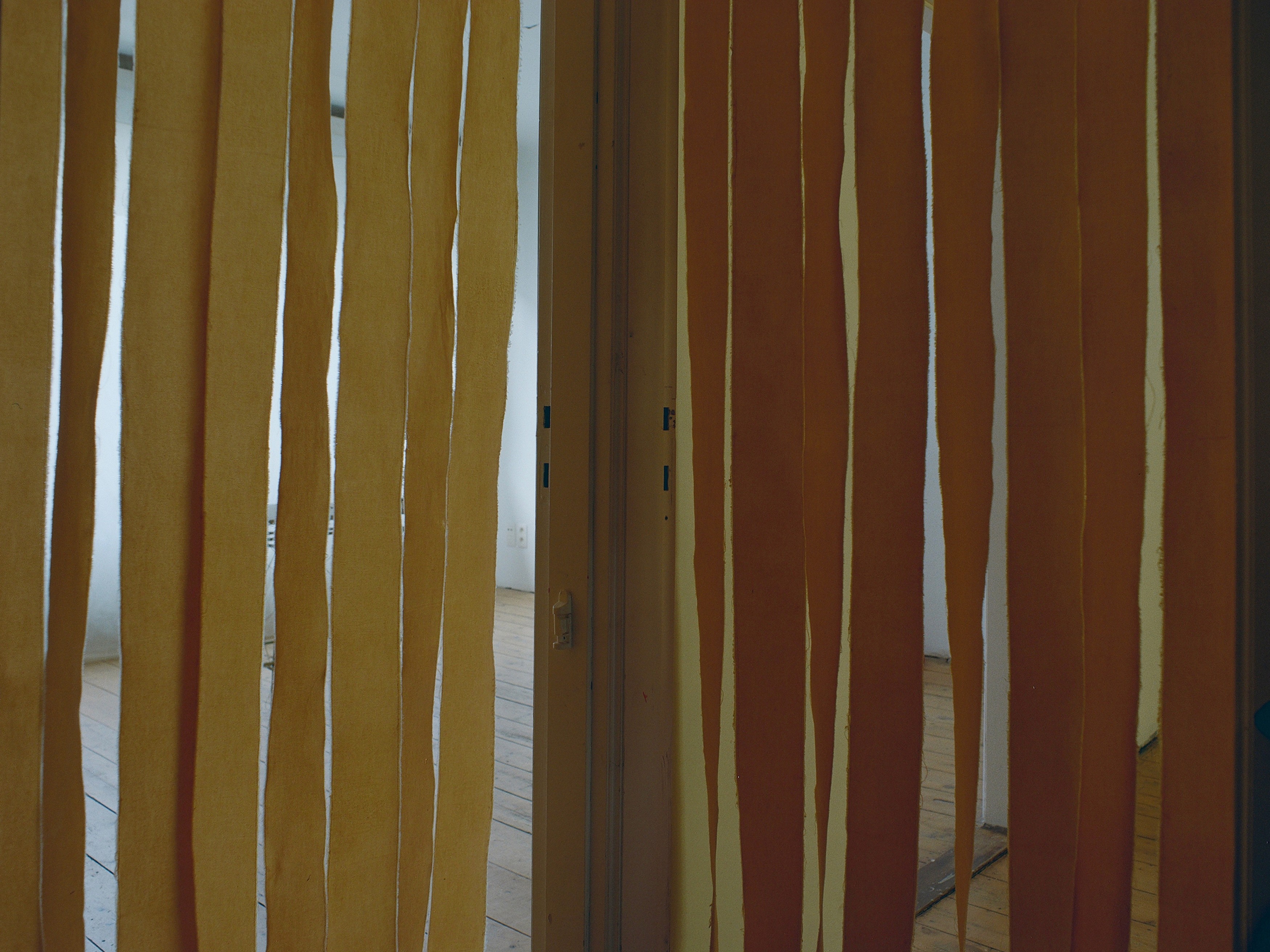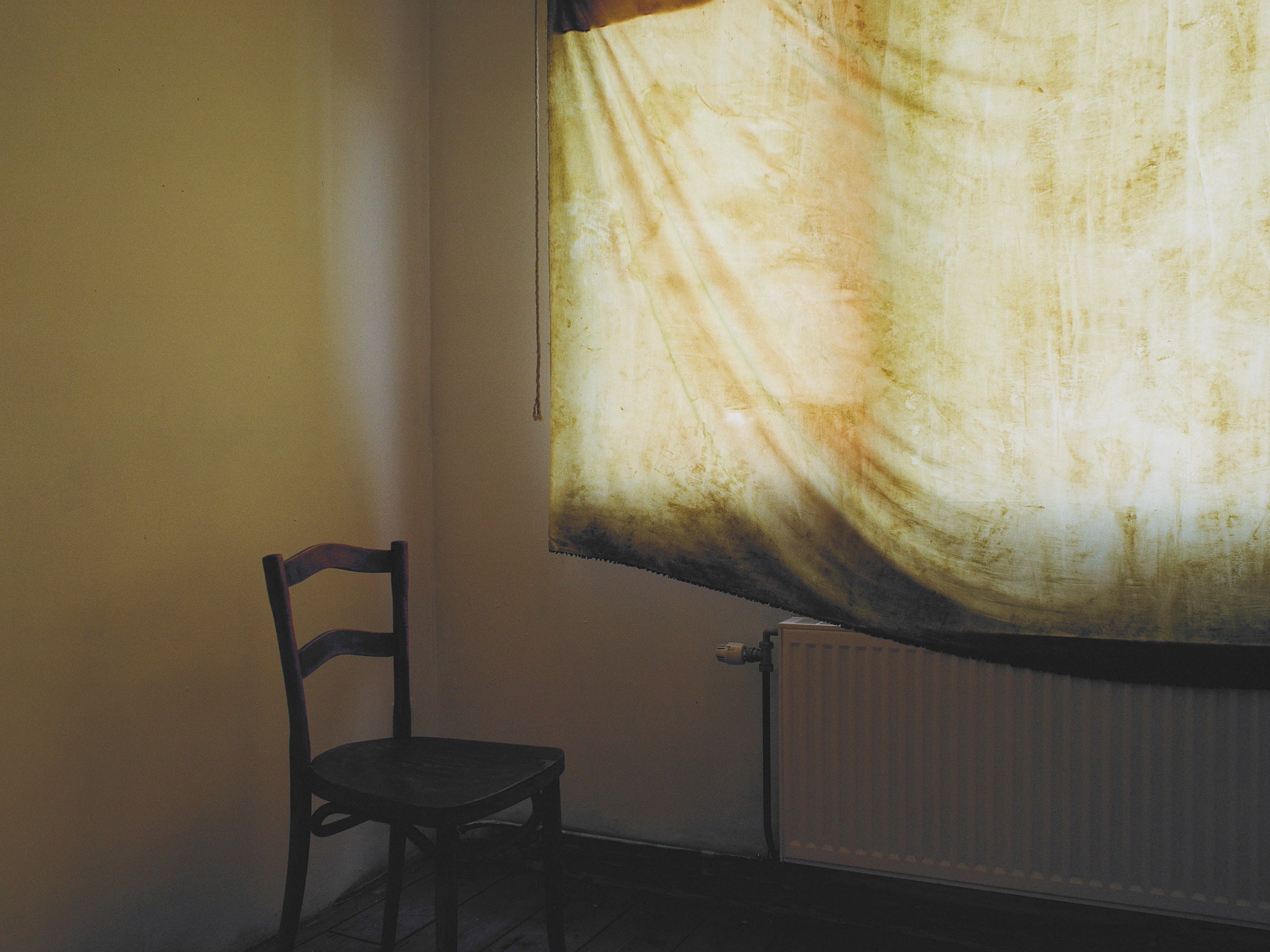 The light coming from the street window and entrance doors is tinted by a fabric treated with a selfmade mixture of beeswax with linseed oil and pumpkin seed oil. The ‘curtains’ closing the space were torn and stitched and treated with the same mixture. The backside window is veiled by a fabric soaked in the 30 million year old clay mentioned above.