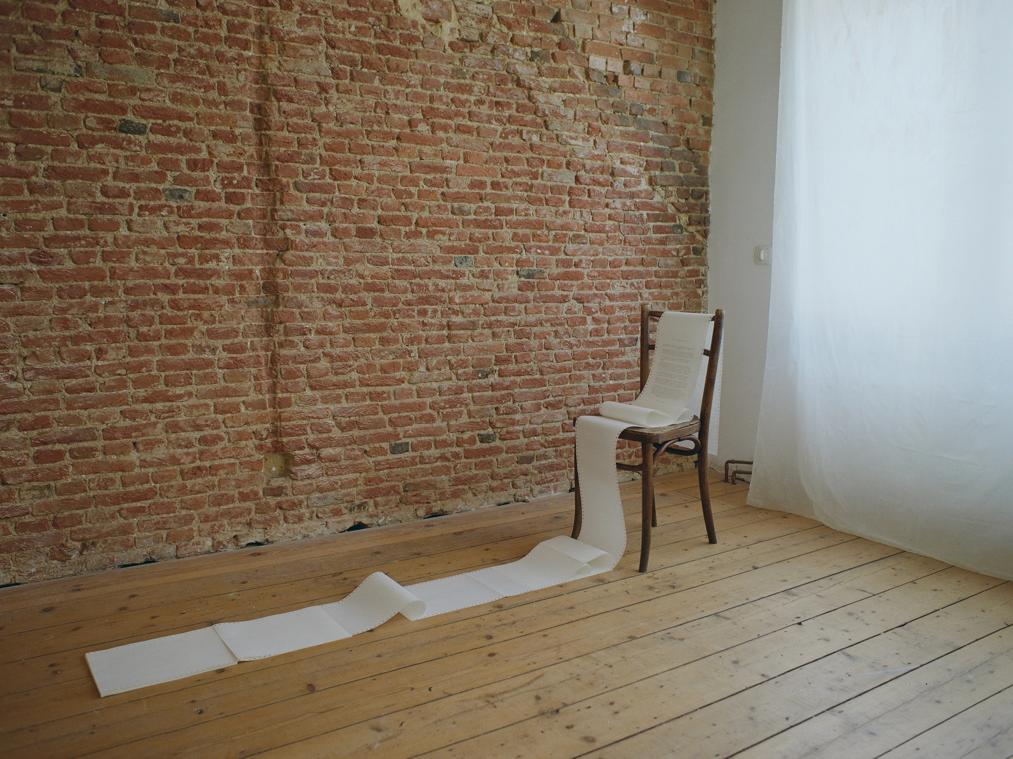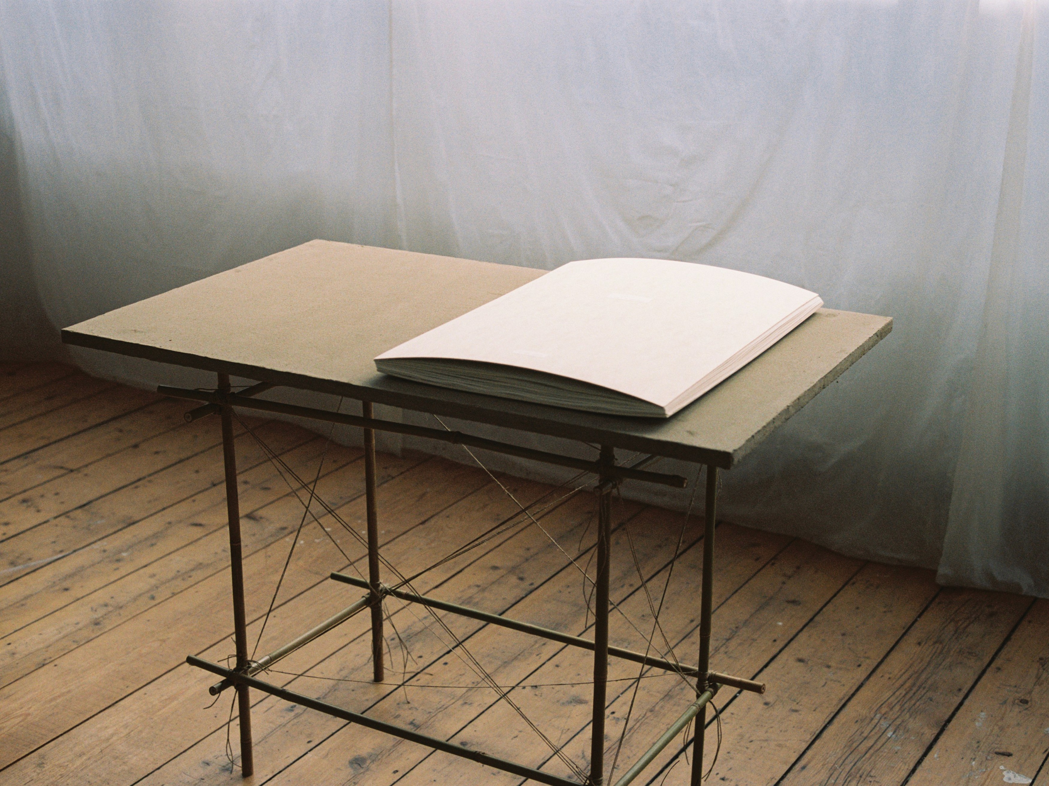 The presentation is a result of multiple collaborations. Anna Breuer made the clay table; Lilla Starkbauer and Sharon de Levi helped Breuer gather the clay, Julia Breuer helped her stitch the split curtains, Kutasi Pál from Kesztölc gave her a big chunk of beeswax (he didn’t let her pay for it), Szabó Miklós taught her how to bind a book, Clemens Schedler gave feedback on the graphic design, Alberto Eloy Rodríguez helped her to turn a negative into a ‘positive’ by rephotographing and developing it with sodium carbonate to make it rich in contrast.