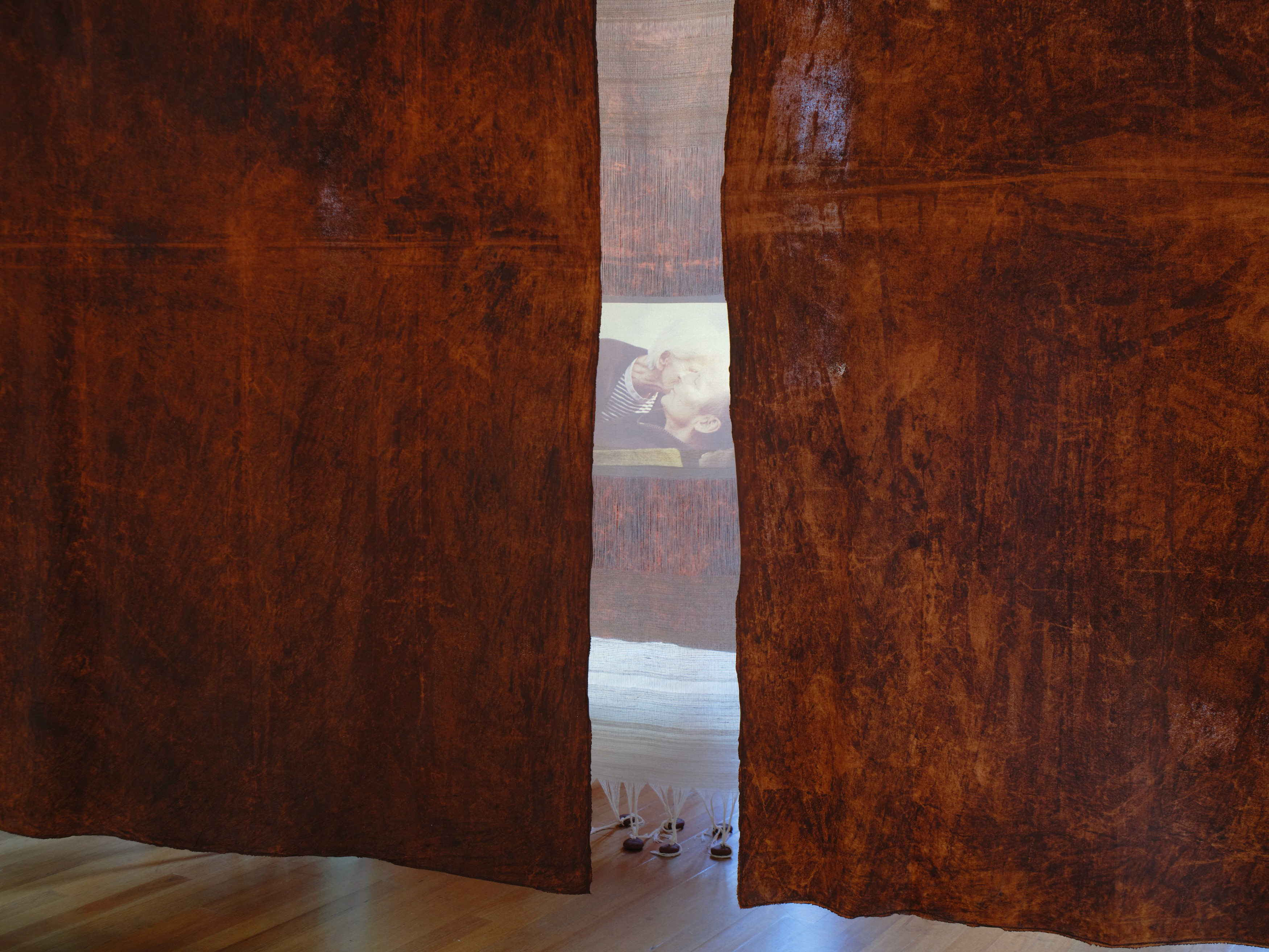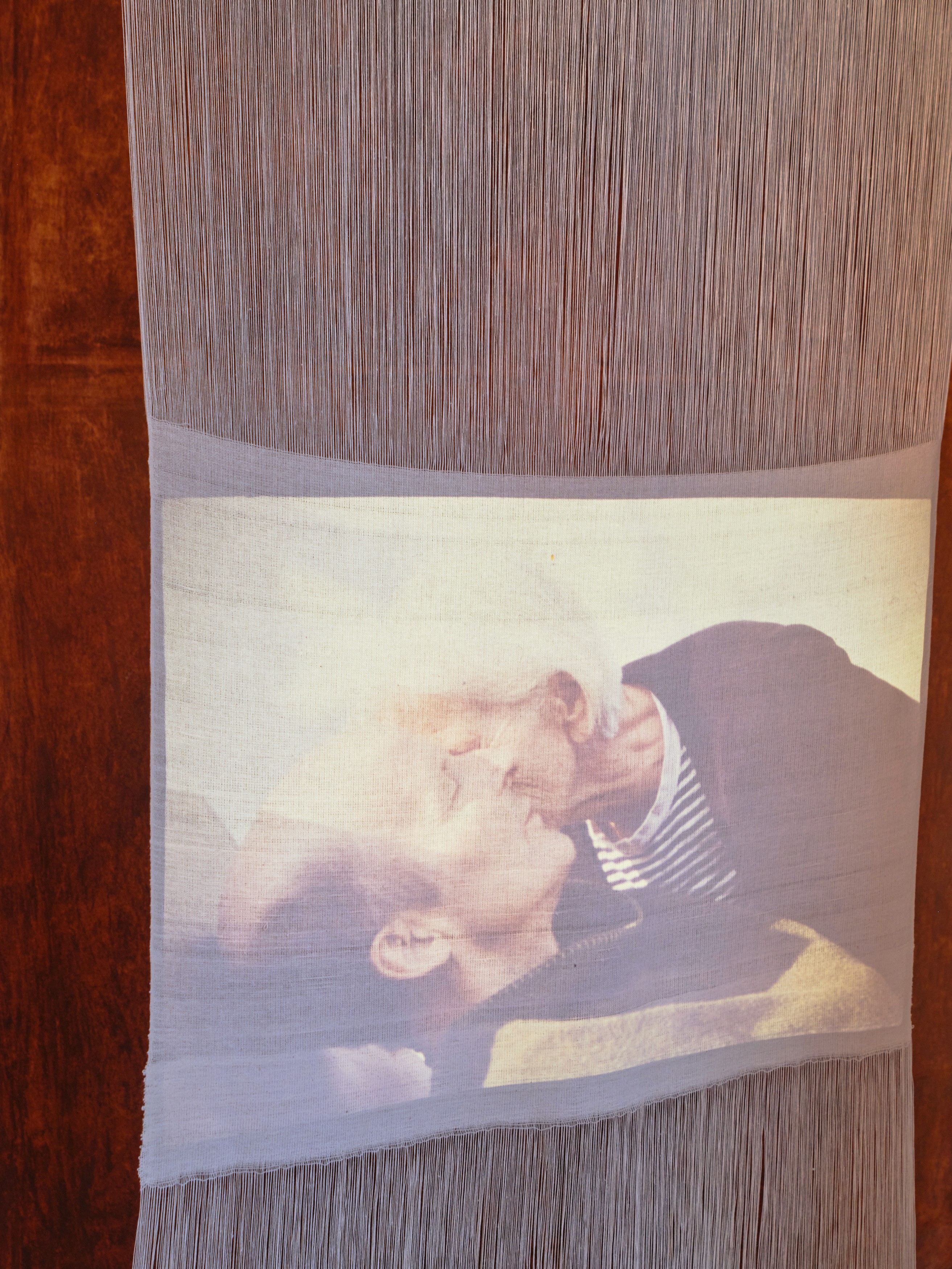 In this new installation, entitled Shine!, a photograph is projected on a self woven white fabric. The photograph shows two people: a man lying on a bed and an older woman stooping over him. The self woven fabric is 70 cm wide and five metres long. It is woven with cotton and Hungarian hemp on a warp consisting of 700 threads. It is weighed down with hand-made clay shapes made of rusty red clay, collected, dried, sieved, rewatered and formed in Budapest. Again, the photograph seems to become immaterial, transparent even, because you can look at it from both sides of the projection screen.